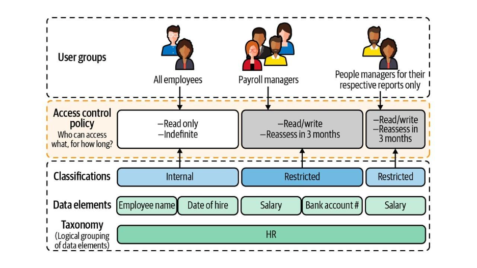 This HR data governance example demonstrates best practices by aligning user access with data sensitivity through clearly defined roles and access control policies. It ensures secure handling of classified data elements like salary and bank account numbers, with periodic reassessment for access permissions.